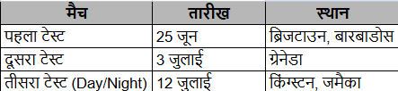 3 टेस्ट मैच खेले जाएंगे – ब्रिजटाउन, ग्रेनेडा और किंग्स्टन में।